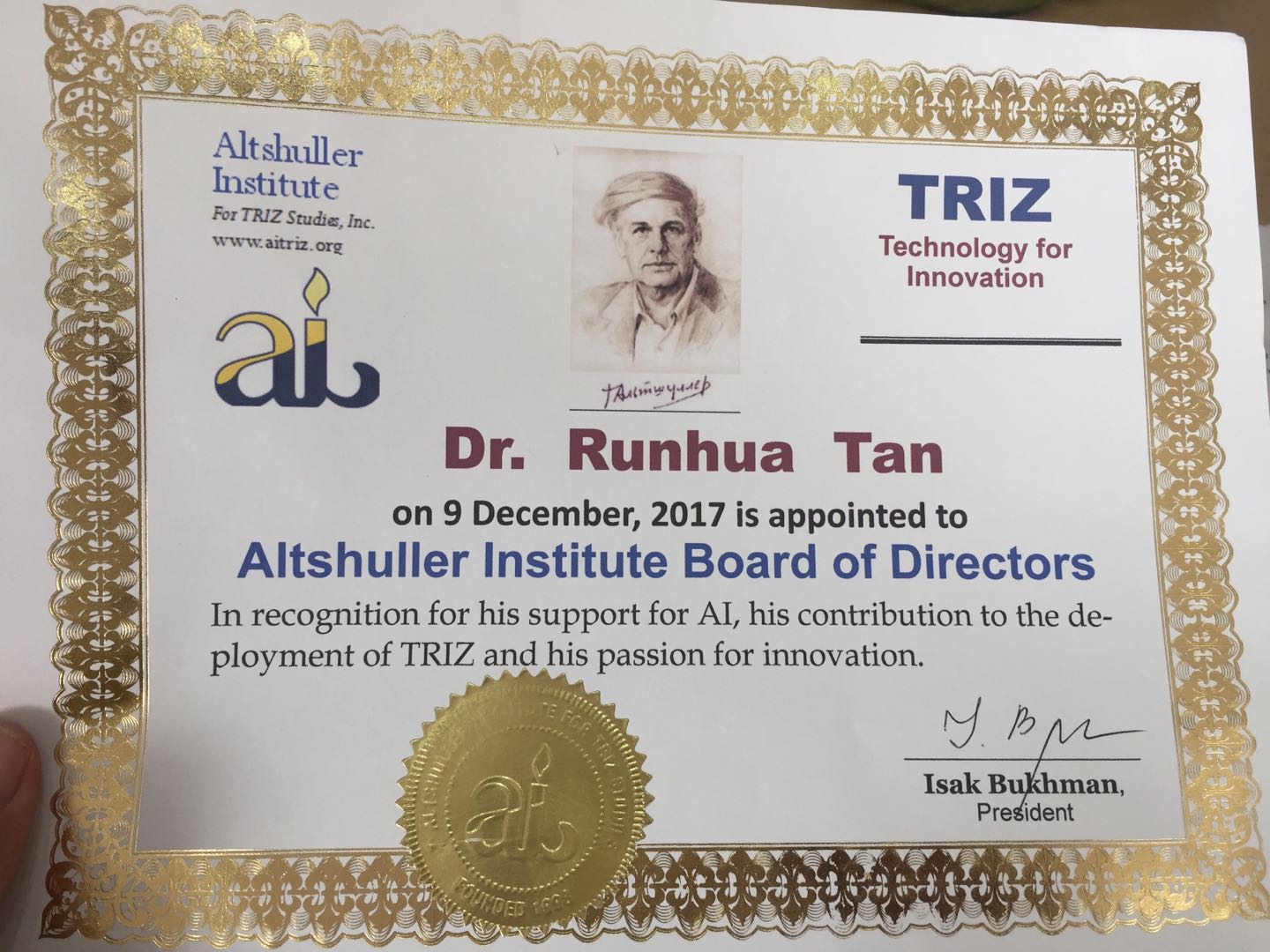 檀润华教授出任美国阿奇舒勒研究院理事会理事并获AITRIZ一级资格认证授权