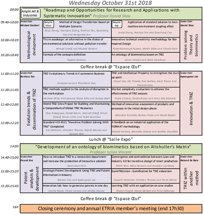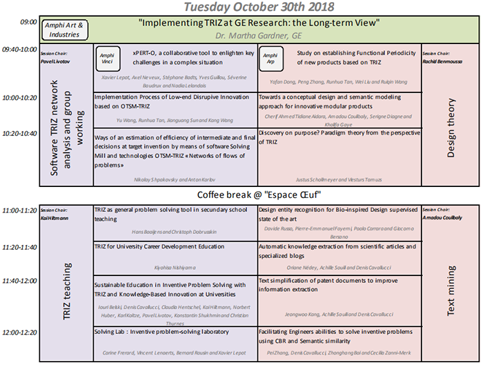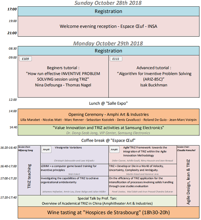 2018年10月28日—31日,在法国斯特拉斯堡举行Triz Future Conference 2018会议,中心主任檀润华教授以及王宇博士、张金璞博士参加会议并作报告,会议议程如下: